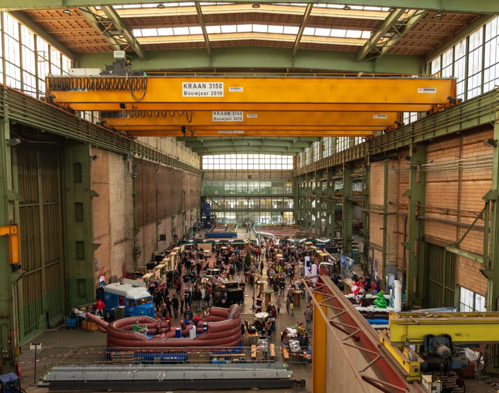 Een grote hal op de werf werd omgetoverd tot een sfeervolle winterbeleving met foodtrucks, kerstdecoratie en een warm event voor medewerkers.